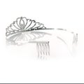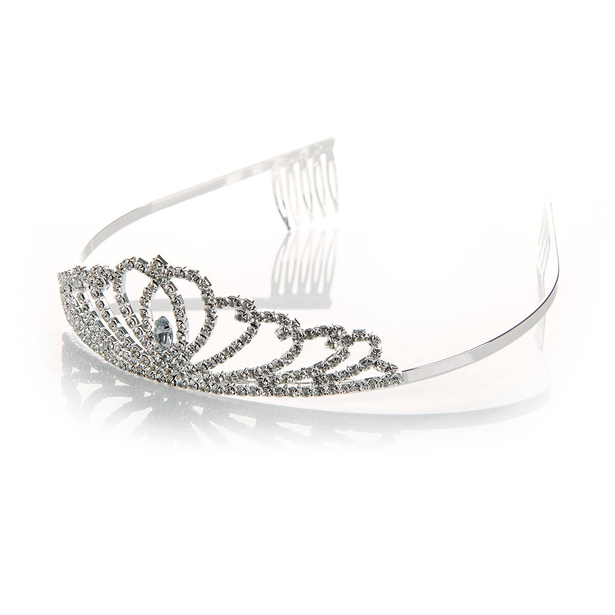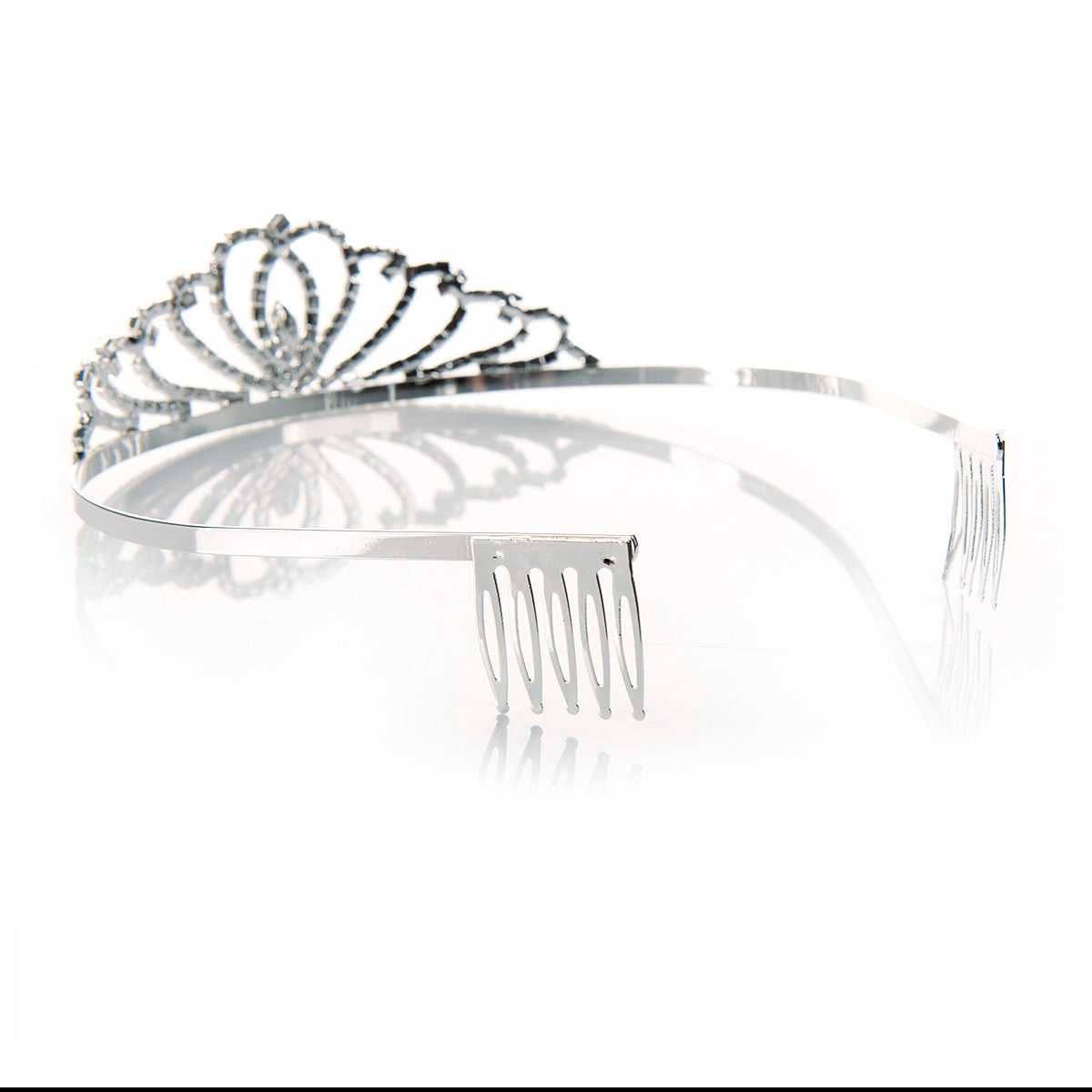 Beautiful silver colored small tiara with bright rhinestones. Comb pins on the sides.